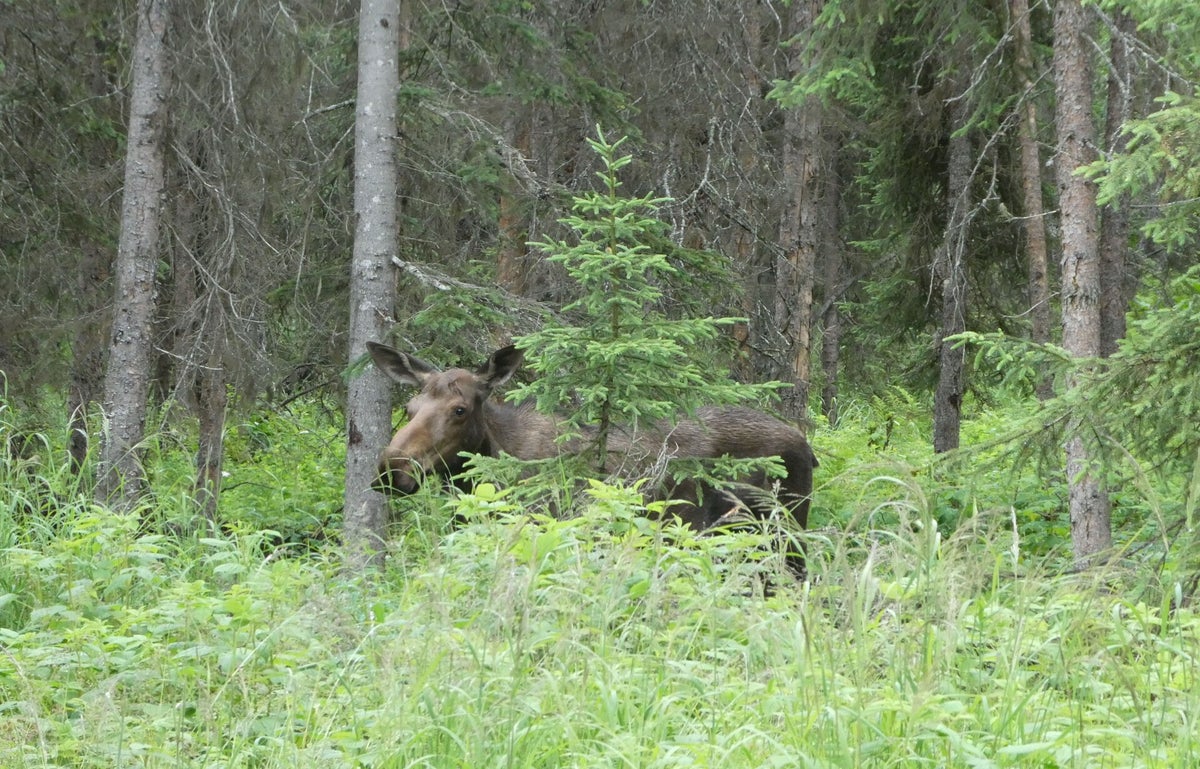 Während wir das Nachtessen zubereiten, geniesst eine Elch-Kuh das frische Gras neben unserem Campingplatz.