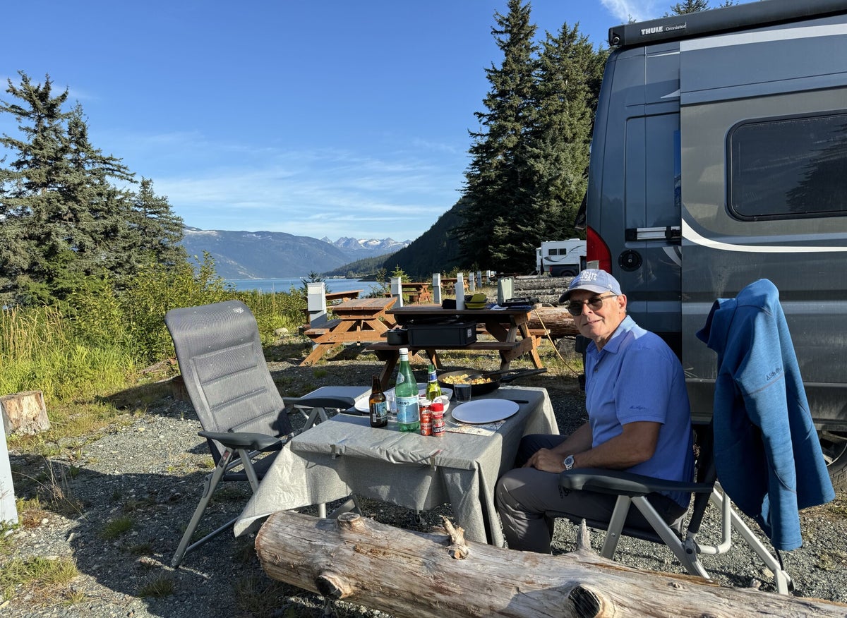 Mit der Fähre in Haines angekommen, fahren wir gleich zum Campground Salmon Run, wo wir mit genussreicher Sicht auf Meer und Berge bei schönstem Wetter im Freien kochen und essen können.