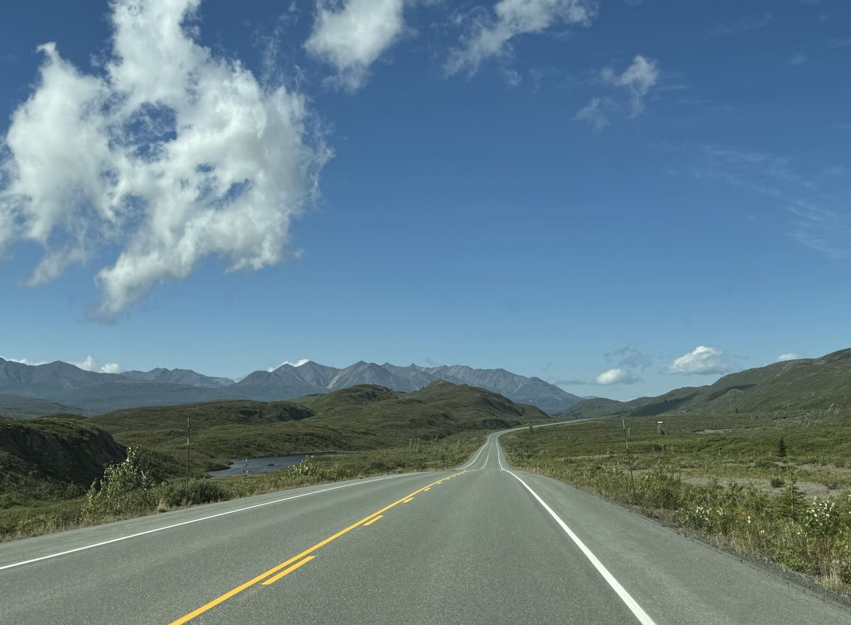 Im breiten Chilkat River Delta befindet sich die Grenze von Alaska zu Kanada, welche wir ein letztes Mal problemlos passieren. Anschliessend führt die Strasse plötzlich steil an bis zum Chilkat Pass auf 1'070 Metern Höhe. Der Highway könnte immer so weiterführen, denn diese hochgelegene, karge Bergwildnis die man durchquert, macht geradezu süchtig.