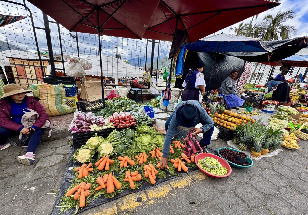 Unsere nächste Station ist Otavalo mit seinem berühmten Markt auf dem Plaza de los Ponchos. Der eigentlich erwartete Handwerkermarkt enttäuscht ein bisschen, da vorwiegend in grossen Mengen hergestellte Souvenirs angeboten werden. Trotz allem geht es bunt zu und her und wir kommen nicht ohne Souvenir aus dem Markt und decken uns noch mit frischem Gemüse und Obst ein.