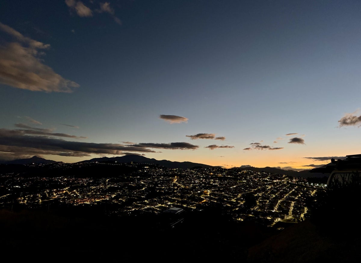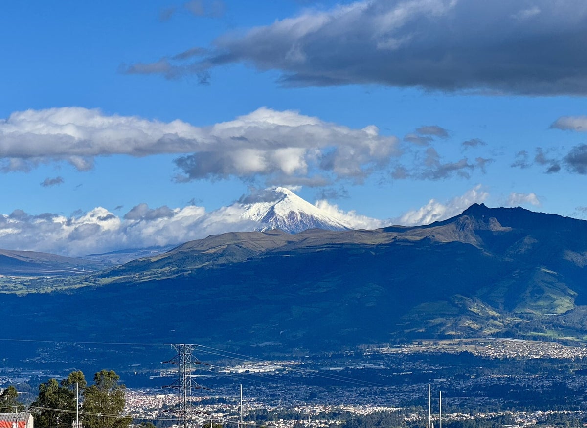 Nach einer nicht sehr warmen Dusche fahren wir noch zurück nach Quito, wo wir etwas ausserhalb über den Dächern dieser riesigen Stadt, mit Blick auf den Vulkan Cotopaxi (5'897 m), einen einmaligen Campingplatz finden.