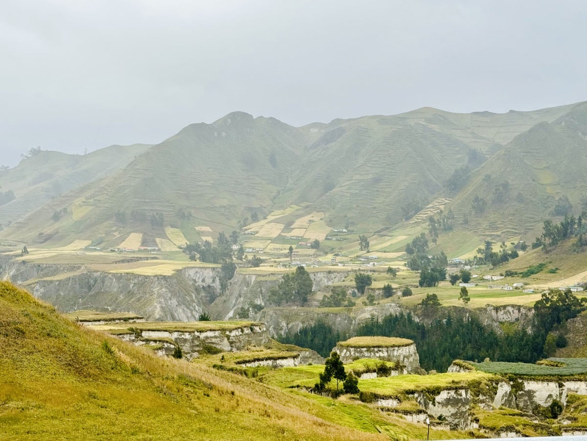 Beim eigentlichen heutigen Ziel, in Pululahua, kommen wir am späteren Nachmittag an. Dieser Ort liegt im Krater des erloschenen Vulkans Pululahua. Das Gebiet bildete sich in uralter Zeit, als der Kegel des Vulkans kollabierte und einen riesigen Krater von etwa 400 m Tiefe und einem Durchmesser von 5 km hinterliess, wo heute Ackerbau betrieben wird.