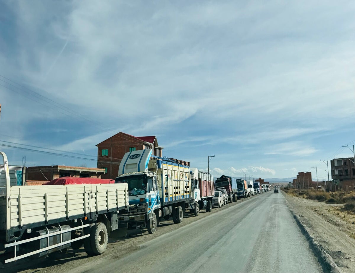 Bevor wir Oruro verlassen, wollen wir unseren Dieseltank wieder auffüllen und fragen bei der ersten Tankstelle stadtauswärts, wo Diesel erhältlich ist. Wohl sehen wir eine lange Warteschlange um einen ganzen Häuserblock, realisieren aber nicht gleich, dass all diese LKW's für die gleiche Zapfsäule anstehen wo wir gleich hinter einem tankenden LKW ranfahren können. Erst als einige Fahrer am Autofenster auftauchen und die Hände verwerfen, sehen wir, dass hinter uns im Abstand einer Strassenbreite ein Reisecar und dahinter die ganze Schlange steht... Wir verhalten uns so, als ob wir nichts verstehen, bis plötzlich ein herbeigerufener Polizist erscheint und uns erklärt, dass wir hinten anstehen sollen. Ich sage ihm, dass ich nur wenig Spanisch spreche und wir dringend etwa 30 Liter Diesel brauchen, damit wir an die Grenze zu Paraguay fahren können. Das akzeptiert er und beruhigt die LKW-Fahrer, während wir in Ruhe auftanken lassen. Das ist ja wieder mal gut gelaufen für uns!