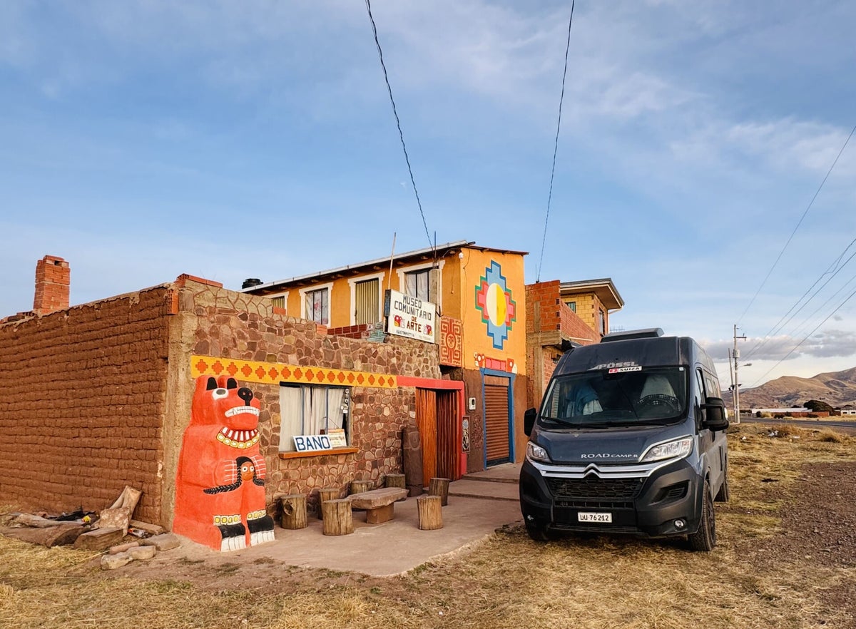 Unser geplanter Halt bei einem Campingplatz am See erweist sich als Flop – niemand da und alles verwaist, also fahren wir noch zwei Stunden weiter bis Tiahuanacu, wo wir gleich gegenüber der Ruinen von Tiwanaku bei einem gebürtigen Argentinier, Archäologe und Künstler mit eigenem Museum, auf dem Vorplatz campieren können.