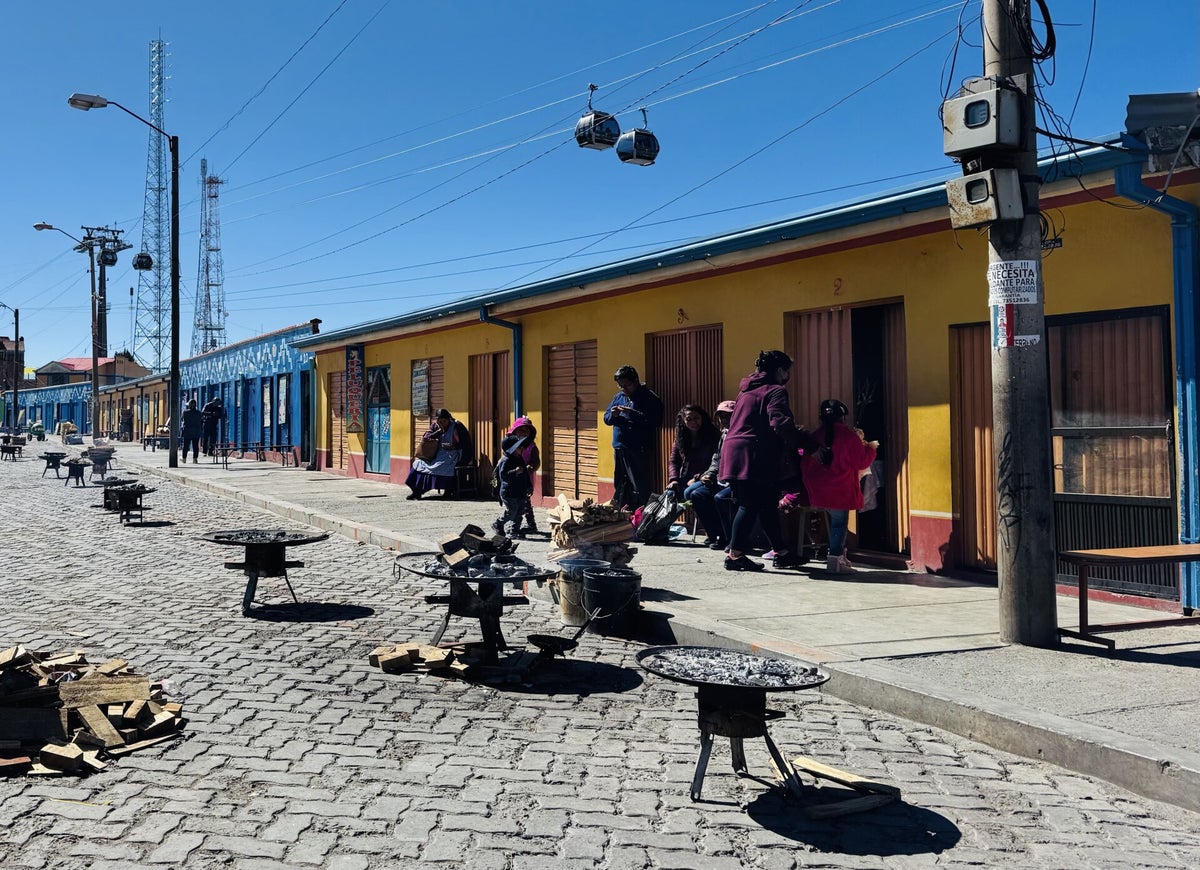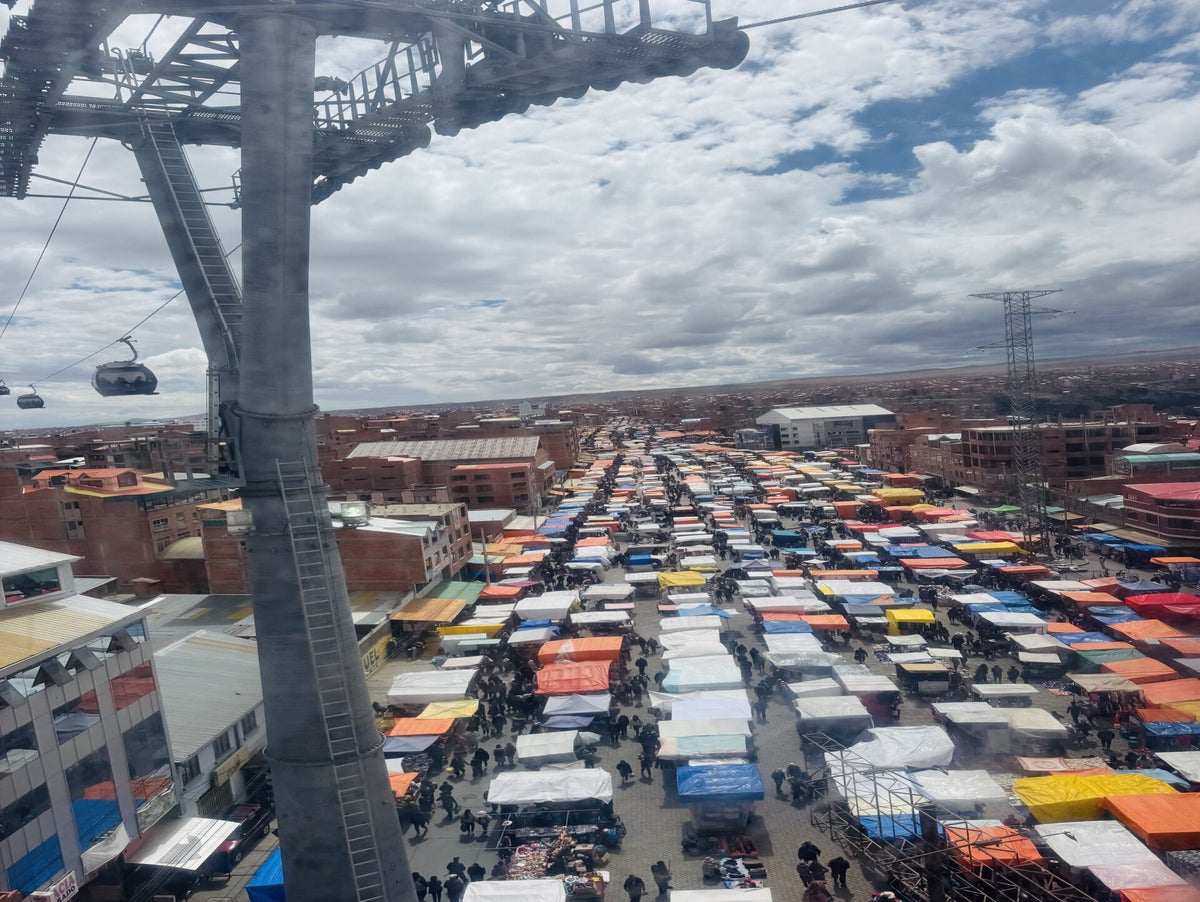 Kaum eingestiegen, sehen wir unter uns den „La Feria El Alto“, den grössten Freiluftmarkt der Welt, welcher jeden Sonntag von frühmorgens bis spätabends in El Alto auf einer Fläche von rund 25 km2 stattfindet. Die vierspurige Hauptstrasse bildet dabei die rund zwei Kilometer lange La Feria, welche sich auch auf zahlreiche Nebenstrassen ausweitet. Aus der Seilbahn gesehen, wimmelt es von Besuchern und es bietet sich uns als eine einmalige Szenerie. Hier findet man ALLES – vom Ei bis zum LKW!!