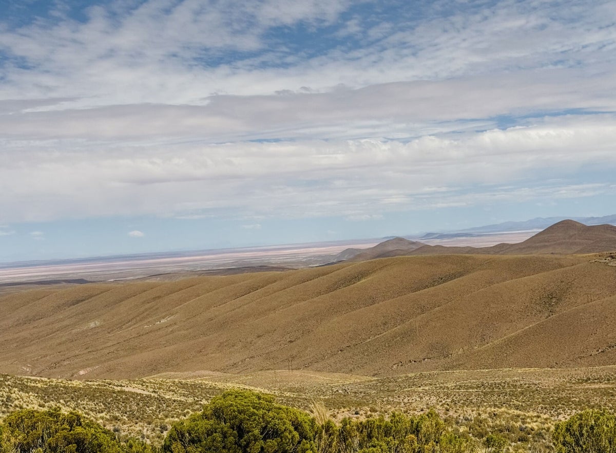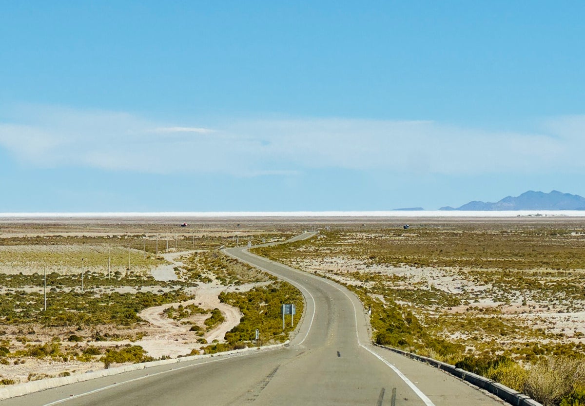 Plötzlich zeigt sich in der Ferne der Salar, ersichtlich als weisser Streifen.