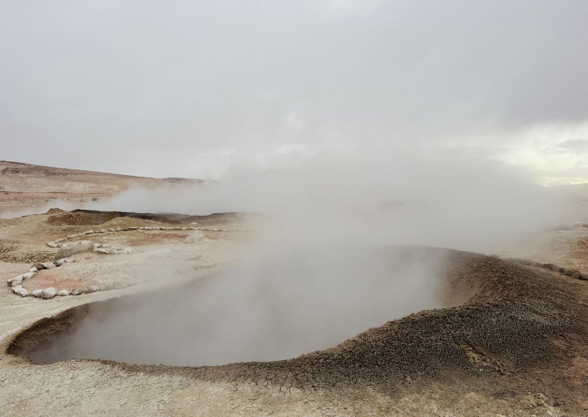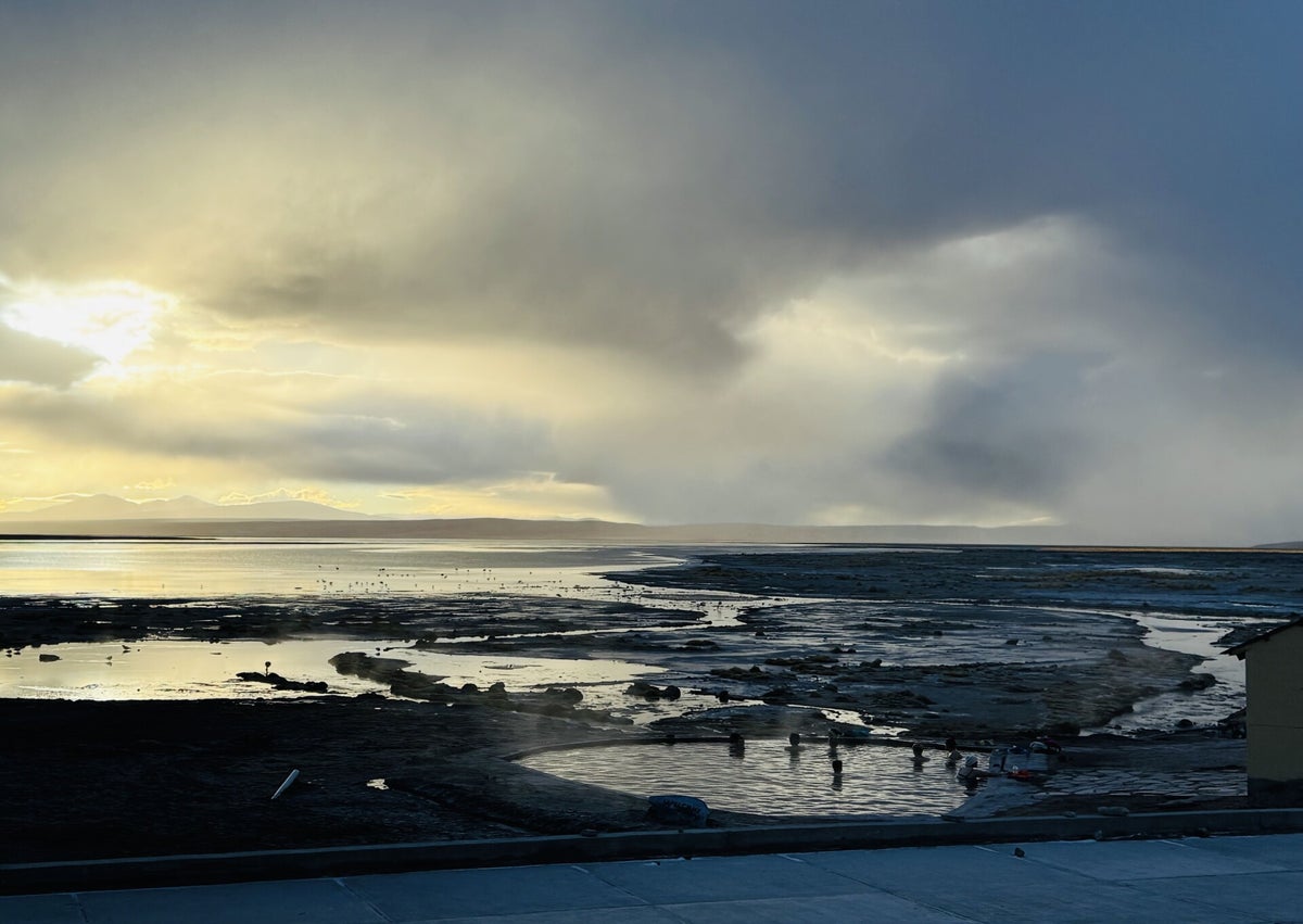 Frühmorgens um 5 Uhr geht es wieder los. Wir fahren in der Dunkelheit bei Sturm und Schneefall zum auf 5'100 m gelegenen Geysir Sol de Mañana, und zu den Thermas de Polques, zum Desierto de Salvador Dali, zu der Laguna Blanca und der Laguna Verde, wo wir schliesslich zum Grenzübergang Chile weiterfahren. Hier verabschieden wir uns von den jungen Japanern, welche per Bus weiter nach Chile reisen und laden zwei andere junge Leute auf, welche nach Uyuni wollen.